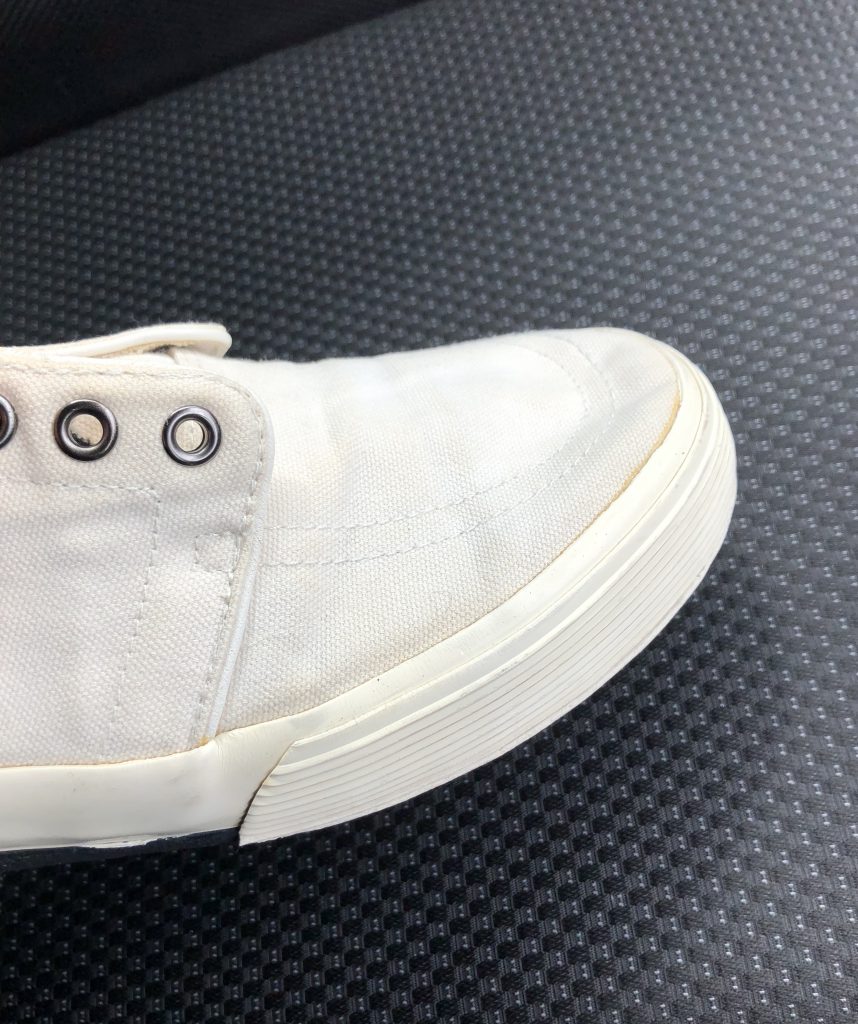 つま先部分の汚れが目立つこのスニーカー。白い靴は清潔感が大切なのに(笑)