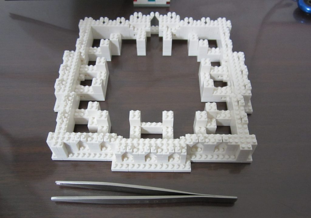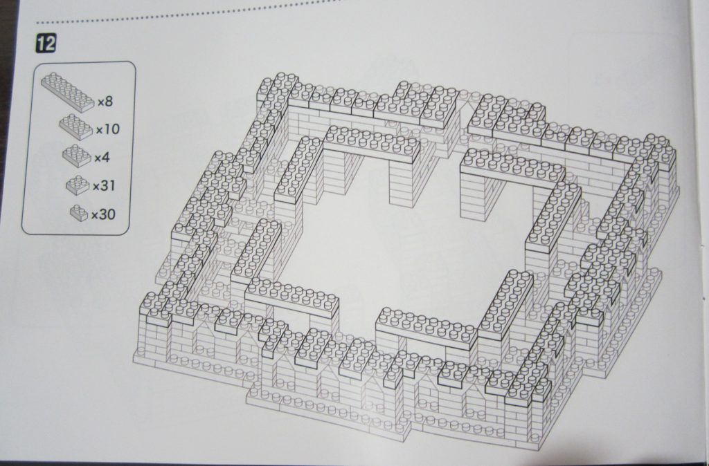 ステップ14はこれまでの外周にも内周にも触れないので、どこからブロックを取り付け始めればいいのか分かりづらいです・・・。下段のブロックの切れ目とか目印を決めてポッチの数を数えましょう。どうせブロックを積み上げれば見えなくなる部分なので、鉛筆とかで印をつけてもいいかも知れませんね!